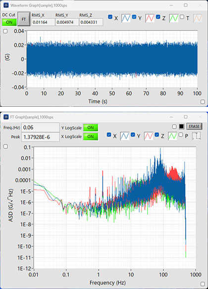 "Vibration Logger" is an evaluation software that allows you to collect measurements from Epson vibration sensors and check their waveforms on a Windows PC.