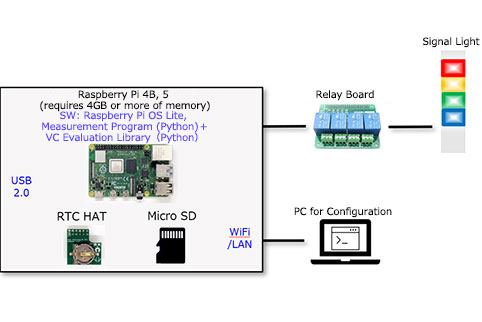 An example application of the VC Evaluation Library is a real-time warning system. By installing a relay control board on Raspberry Pi with the VC Evaluation Library and controlling a signal light, you can create a system where the light turns on according to vibration levels. This system enables continuous vibration monitoring and real-time visualization of vibration levels. To build this system, download the Sample Code and refer to the User Guide provided in this page.