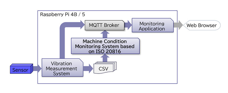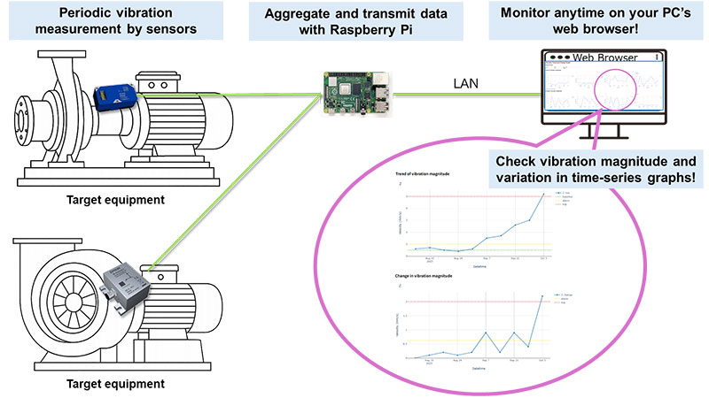 This system enables ISO 20816-compliant condition monitoring using Raspberry Pi and Epson acceleration/vibration sensors.