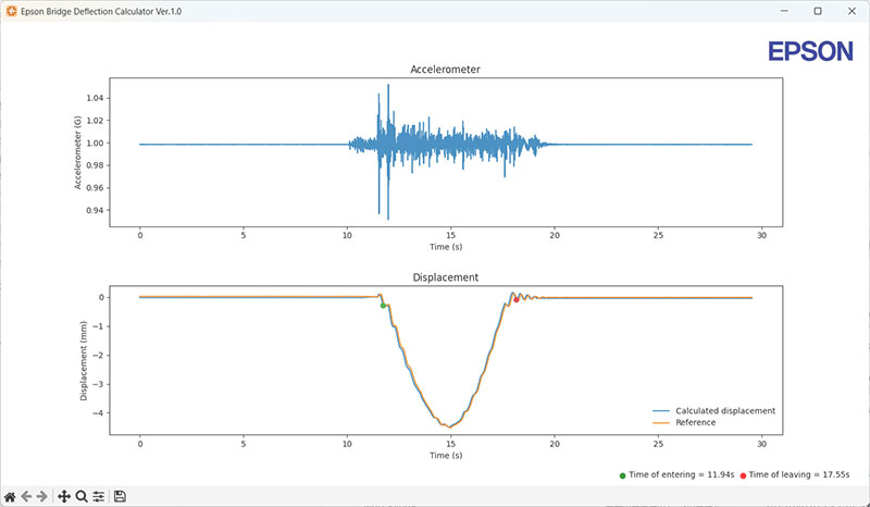 橋梁における車両通過時の応答加速度積分による変位を算出するソフトウェア「Epson Bridge Deflection Calculator」を提供しています。このソフトウェアは加速度センサーM-A352/M-A552/M-A370で計測した加速度データから橋梁の変位推定結果を算出・表示するソフトウェアです。接触式変位計などから得られた変位リファレンスデータとの比較も可能です。