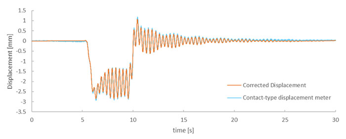 水晶加速度センサーM-A352AD10を、2室箱桁構造の鉄道橋梁に設置し、列車通過による変位を計測しました。加速度センサーにより計測された加速度を2階積分して算出した変位と、接触式変位計の結果と非常によく一致しました。詳細は事例ファイル「橋梁を計測してみた!/解析してみた!」をご覧ください。